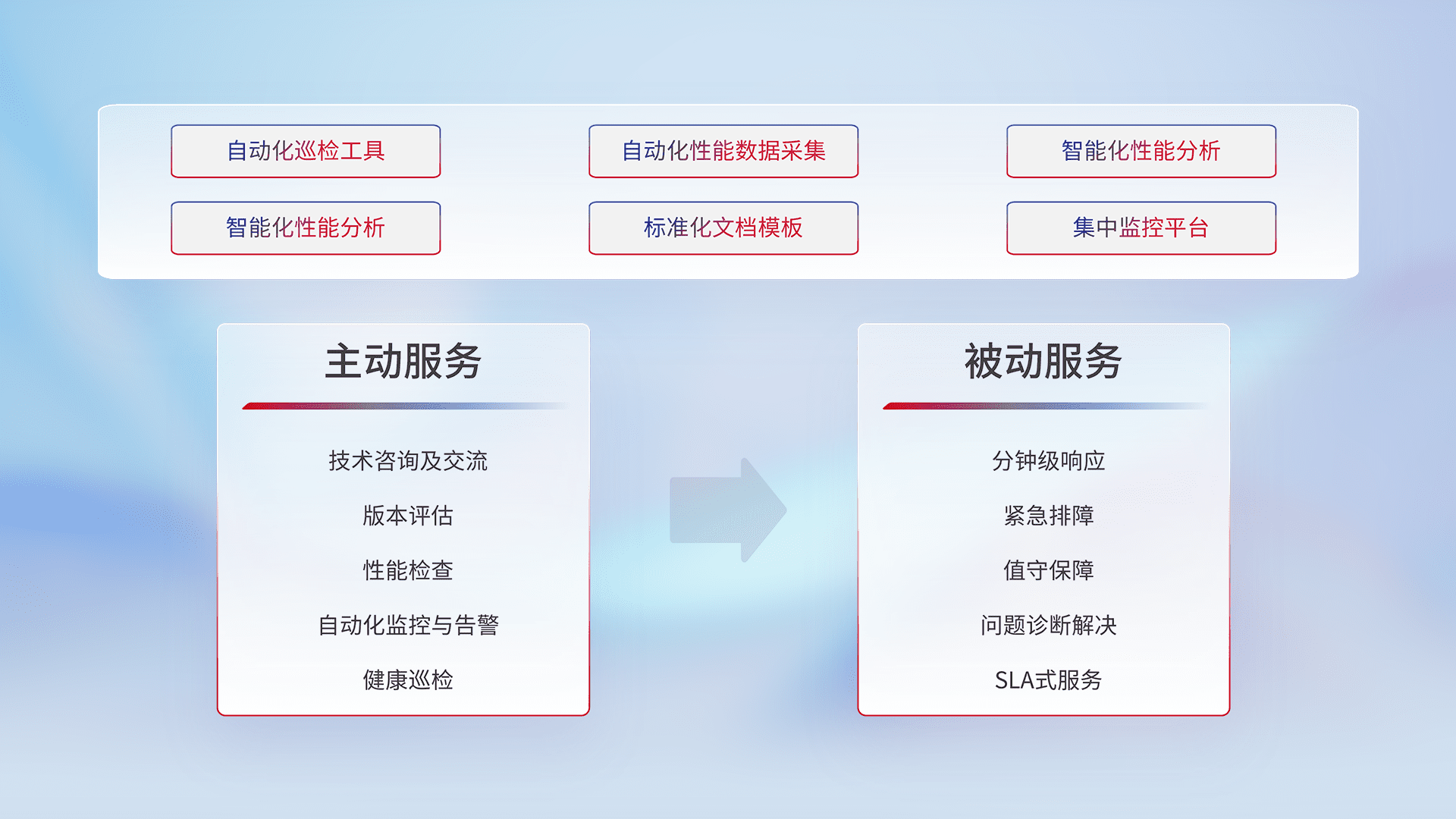 智能化工具和标准化文档,,保障服务质量,,,,提供主动服务(包含技术咨询、、、版本评估、、、性能检查、、、、自动化监控与告警、、、健康巡检)和被动服务包含(分钟级响应、、、、紧急排障、、、、值守保障、、、、问题诊断解决、、、、SLA服务)。。。